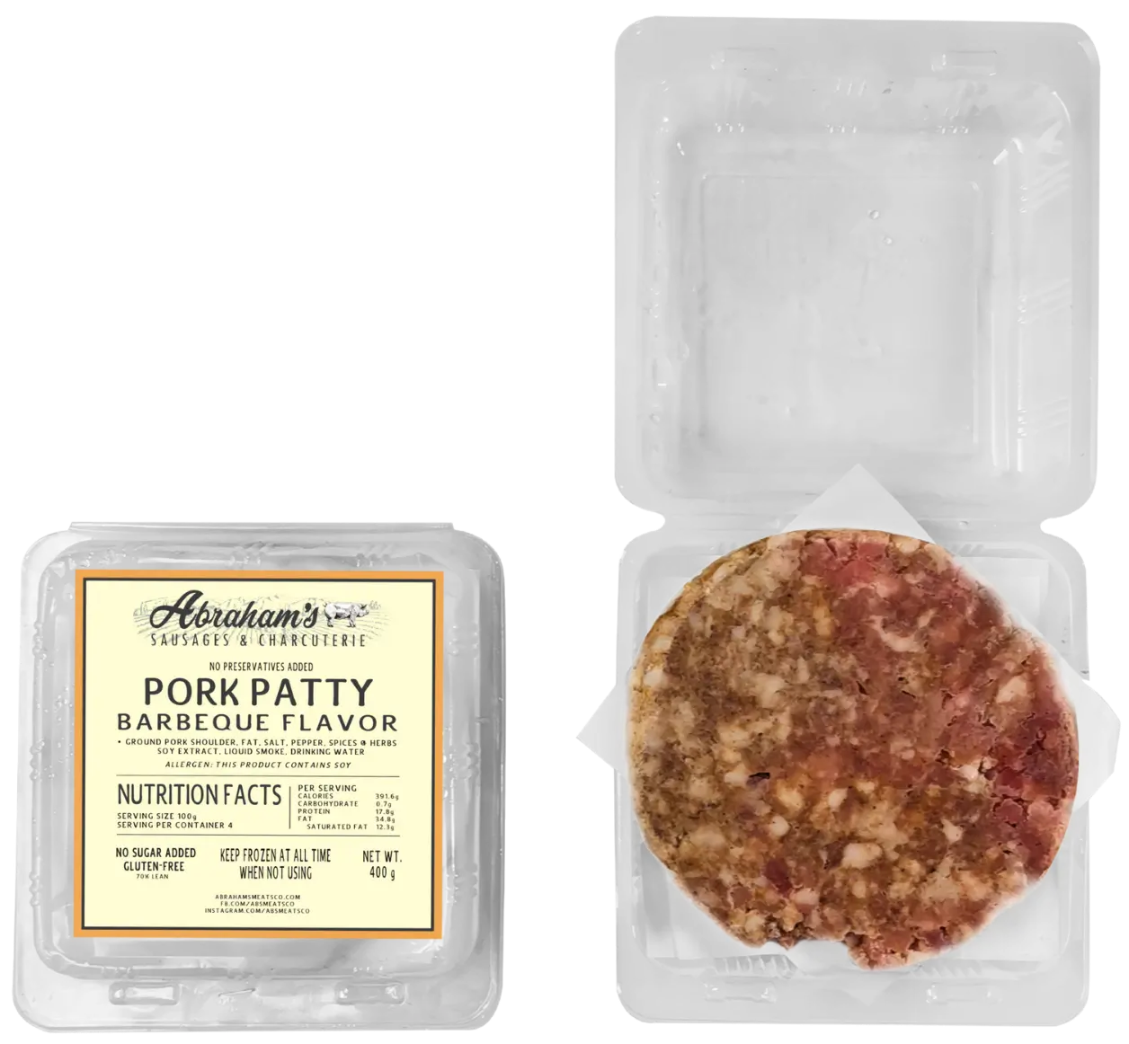 BBQ pork patty is a ground pork burger patty seasoned with smoky-sweet BBQ spices including sweet paprika, brown sugar, liquid smoke, garlic, onion, and Worcestershire sauce. Abraham’s BBQ pork patties deliver authentic BBQ flavor without hours of smoking—perfect for burgers, sliders, and creative menu applications.
